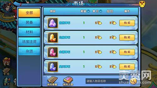 《紫青双剑》的市场系统中可以选择在市面上已有的商品进行购买,如果自己有想要去拍卖的物品也可以通过寄售进行拍卖。首先点击头像,找到在屏幕上左下方的市场按钮,点开之后你会发现屏幕上多了很多商品,这就代表您已经进入到拍卖行的界面了。随后您可以在左侧列表中可以选择装备和道具,点开后可以看到当前所有玩家在出售的物品。而且还可以在界面下方直接输入物品名称并点击“搜索”,以缩小寻找范围,真是太方便不过了。