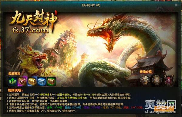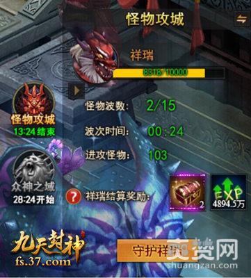 在37《九天封神》的怪物攻城活动开启前5分钟,朝歌会出现一个祥瑞,然后再正式宣布活动开启,随后,朝歌会出现3个传送门,传送门会每分钟涌入小怪、精英和BOSS攻击祥瑞,这些怪物总共有15波,玩家们可要准备好血量,以免在与怪物厮杀的时候因血量不足而被反杀了。