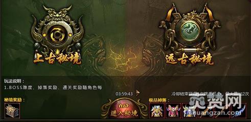 上古秘境:每天可进入两次,每四小时可免费进去,击杀BOSS可获得高级装备,此外还可获得一级魂石宝箱,使用后获得一个一级随机属性魂石。