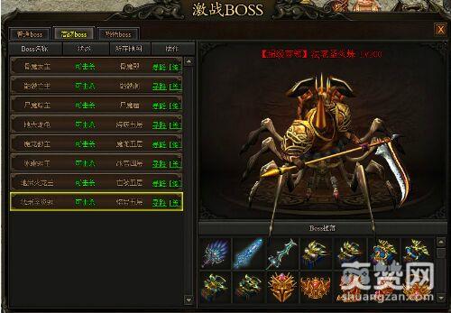 一点开那个按钮,迎面而来的基本都是熟悉的boss身影……沃玛教主、白野猪、祖玛教主……还有一个全新的面孔,特别是地天龙龟和冰霜蛛王,两个超级大的造型,一个是巨型的龙龟,也就是传说中的玄武,一个是超大的蜘蛛,有种迎面而来的霸气感觉。其中,冰霜蛛王就是boss,刷新间隔时间长达120分钟,当然拉,爆的东西绝壁也是最给力的。