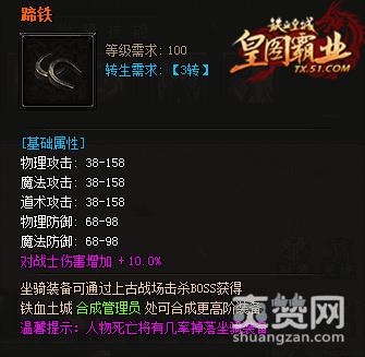 铁血皇城坐骑幻化强势来袭,不仅拥有炫酷的外形更加上了吊炸天的属性。首次加上了对各职业的伤害减免,不仅仅对属性有了新的改变,更对以后的PK加上了新的元素。使PK更加的激情。不仅仅是属性的更改,对于外形是相当的炫酷哦。对赶战场骑上拉风的坐骑,更是铁血皇城新的风景线。