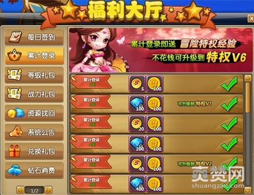 玩家累计登录2天,可以升级到冒险特权V1;玩家累计登录5天,可以升级到冒险特权V2;玩家累计登录15天,可以升级到冒险特权V3;玩家累计登录60天,可以升级到冒险特权V4;玩家累计登录120天,可以升级到冒险特权V5;玩家累计登录200天,可以升级到冒险特权V6.冒险特权V1~V6,只要玩家持之以恒的登录,无需花费,特权免费升级.