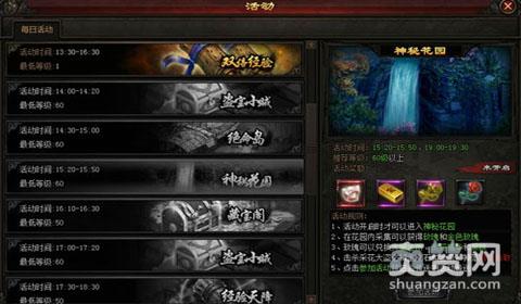 当玩家等级达到60级就可通过沙漠土城的活动传送NPC进入神秘花园地图其活动于每天的15:20-15:50、19:00-19:30开启,玩家参与神秘花园就可获得大量的金币,还有一定机会获得金刚石和符石碎片,由于时间有限,玩家要注意一下时间哦!