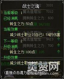 另外,转生后会有转生之力,转生之力可以用来提高923yx《武易》中的魄力——战士之魄、法师之魄、道士之魄、野兽之魄。这些魄力可以减少相应职业对自身的伤害。