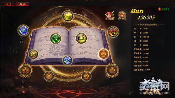当天书达到一定阶段后会解锁书印系统,消耗一定数量的进阶石可解锁书印镶嵌格,整个系统共有12个镶嵌格,可以镶嵌五种属性的绝对值加成、百分比加成和全属性加成三大类书印。当玩家将所有镶嵌格全部开启并镶嵌上对应的属性后,就可以大幅强化角色战斗力,同时给予角色更强大的防御能力。