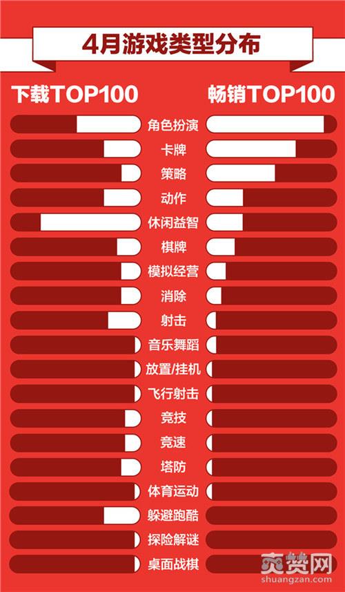4月TOP100畅销榜与下载榜游戏类型分布分析