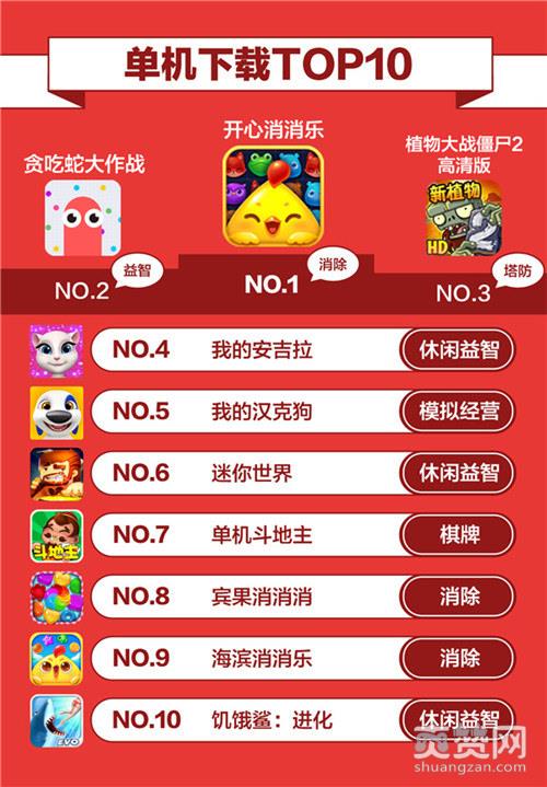 而在单机下载榜方面则波澜不惊,常青树产品《开心消消乐》依旧排行第一,去年的现象级产品《贪吃蛇大作战》则人气不减,排名第二,而老产品《植物大战僵尸2高清版》则排行第三。由此看来,网游产品由于在各大厂商的重金投入下,全新的精品大作不断,时不时给下载榜带来新一轮的变化,而单机下载榜方面,由于单机核心玩法相对难以创新,长期被老产品垄断,市场需要更多类似去年的《贪吃蛇大作战》这样带来惊喜的创意黑马产品。
