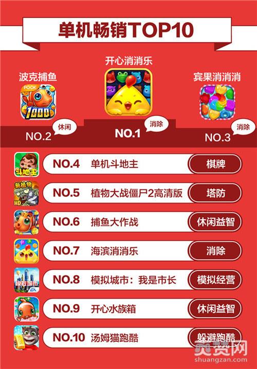单机畅销榜中,消除类产品依然是广大休闲玩家的最爱,《开心消消乐》、《宾果消消消》与《海滨消消乐》占据了TOP10里的3个名额,分列第一、第三与第七。同时,捕鱼类游戏也表现不俗,《波克捕鱼》与《捕鱼大作战》各自取得了第二与第六的成绩,尤其是《波克捕鱼》以其在线捕鱼的独特玩法,带来了不同于以往单机类捕鱼游戏的社交与竞技的全新体验,加上其持续不断的版本更新,吸引了广大的热爱“捕鱼”类游戏的玩家,进而从众多单机产品中脱颖而出,直逼休闲霸主《开心消消乐》,证明了休闲游戏引入在线社交机制,突破纯单机玩法局限后产生的收入潜力。而另一款在核心玩法上与捕鱼游戏反其道而行之,主打“养鱼+社交”模式的益智休闲游戏《开心水族箱》则保持在第九的位置。
