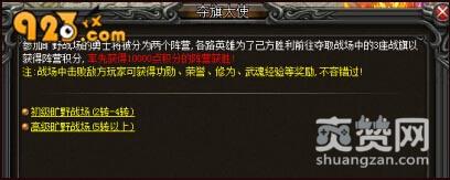 923yx《武易》中的夺旗大战活动于每周二、四、六的17:00-17:30点进行,大家可于跨服主场景的NPC夺旗大使处进入活动。活动分为初级及高级两个战场,2转-4转玩家可进入初级旷野战场,而5转以上玩家可进入高级旷野战场。