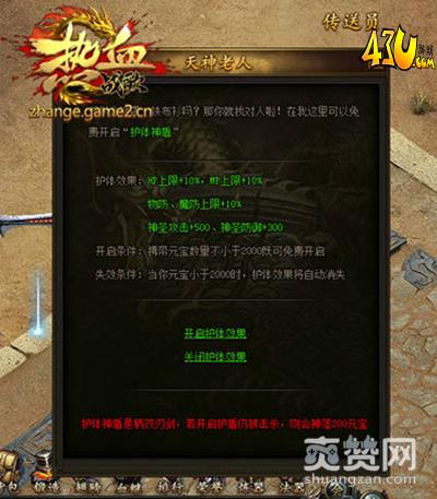 想要在战场之上保持屹立不倒的姿态,那么你需要更硬更强。43u《热血战歌》护体神盾,前往盟重NPC天神老人处,即可开启免费开启“护体神盾”,开启以后将会为你带来HP上限增加20%,MP上限增加10%,物理防御、魔法防御上限增加10%的超强属性加成,让你成为全场最硬真男人!
