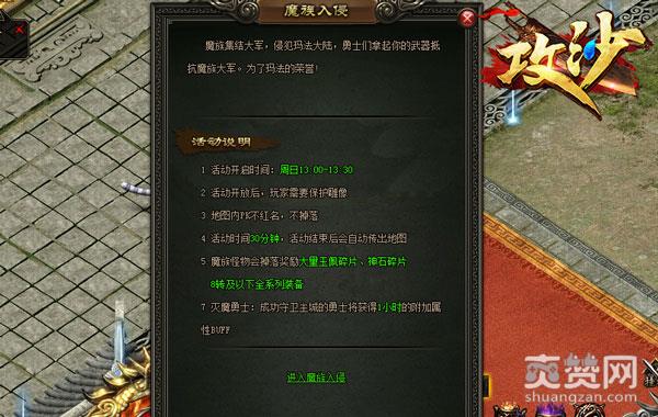 1、在游戏中,魔族入侵是个定时活动,每周日13点开始,玩家应准时参与;