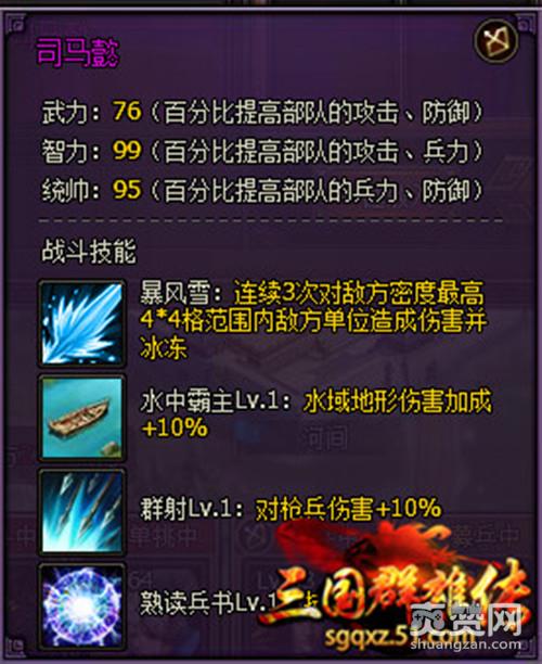 这里再给大家推荐51《三国群雄传》中比较好用的将领司马懿,司马懿属于弓兵,喜欢打伤害的玩家可以考虑把甘宁换下,司马懿的技能是暴风雪,在战斗方面属于持续性伤害,而且还有冰冻的效果,在战斗过程中可以起到拖延敌军的效果。