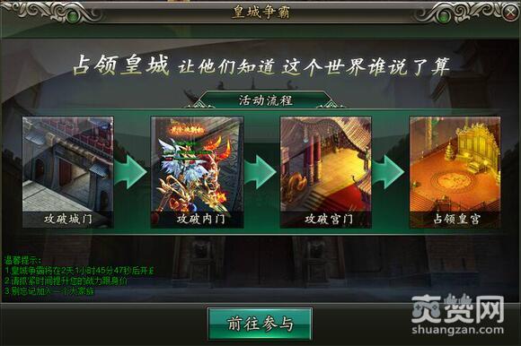 皇城争霸在开服3天后,每隔3天就会开启一次,时间都是在晚上的19点30分,想要参加皇城争夺的玩家,需要看好倒计时准时加入战斗。皇城争霸是证明家族实力最好的途径,大家是为了家族而战,也是为了自己而战,因为战胜的奖励也非常诱人。