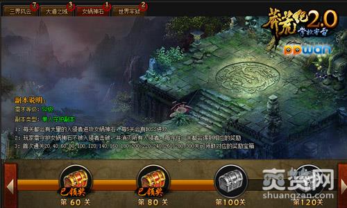 女娲神石在ppwan《莽荒纪》中属于单人守护副本,只要达到52级就可以参加。在女娲神石副本中,共有300关等着玩家守护,每关都会有大量的入侵者进攻女娲神石,每5关将会出现一大BOSS进攻。玩家的主要任务就是守护女娲神石不被入侵者击破,并且消灭所有的入侵者,每守住一关都会获得相应的奖励!此外,玩家首次通关20、40、60、80、……、300关时,还可以领取对于的奖励宝箱哦!