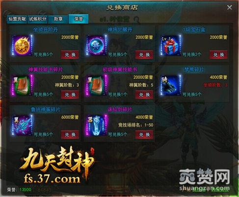 在37《九天封神》竞技场中累积下来的荣誉不仅仅是证明你曾挑战过多少个人,这些荣誉累积到一定的程度,将会为你带来更大的奖励。玩家获得的荣誉可以到荣誉商店兑换坐骑碎片、神翼碎片和神器碎片,要切记存荣誉冲排名,以获取强力神器。