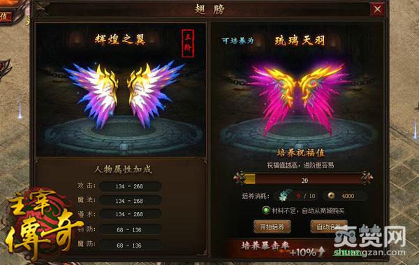 玩家可以利用羽毛和绑金培养翅膀,进而提高翅膀对角色攻击、魔法、道术、物理防御和魔法防御的属性加成!