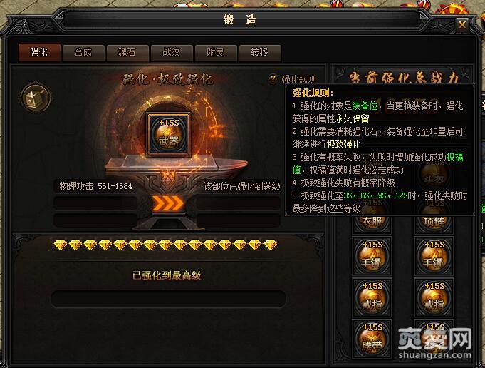 2.强化需要消耗强化石,装备强化至15星后可继续进行极致强化。