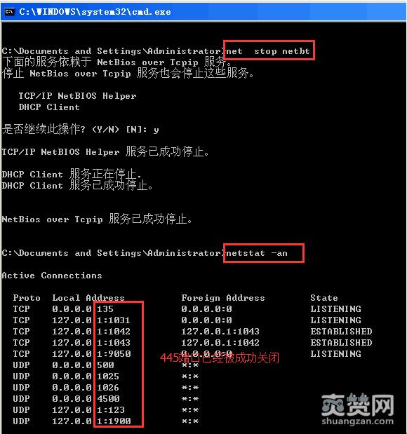 2. 如上图显示445端口开启的话,依次输入以下命令进行关闭: