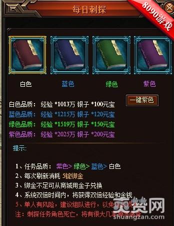 到达敌国王城后院,在流浪者处可以刷新任务品质,品质越高,奖励越丰厚。品质依次是白、蓝、绿、紫。每次刷新需要5锭绑金。绑金不足时可以从商城用金子兑换。在系统双倍时间之内,还能获得双倍经验和金钱。刺探任务角色死亡,将有很大几率掉落装备。所以建议组队进行。以免造成损失。