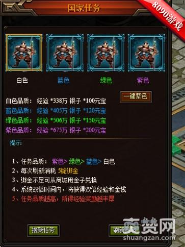 在刀枪剑传奇中,玩家需要在王城的帮会管理员那里接受任务,任务分为不同的品质,依次由白到蓝到绿到紫。不同品质的任务奖励也是不同的。每天国家任务只有2次,所以还是尽量刷新到高品质比较好。每次刷新只需要5锭绑金。在系统双倍时间内,将获得双倍经验和金钱。接受任务之后,会需要完成4个小任务,分别需要击杀异族流民,异族叛军,变异木人,异族步兵20个。完成击杀之后就可以回到帮会管理员处完成交付任务了。