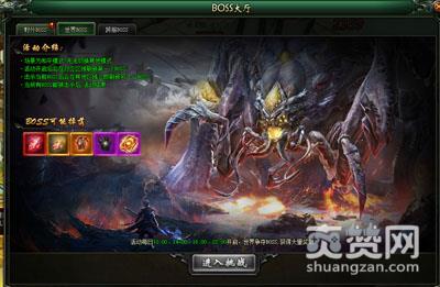 BOSS大厅分为:野外BOSS,世界BOSS和跨服BOSS。玩家通过击杀BOSS,从而获得高品质装备,升级境界所需的道具,游戏内消耗品绑定元宝,还有升级装备所需的道具等,击杀BOSS期间会有幸运抽奖,从而让玩家的战斗力进行大幅度提升。