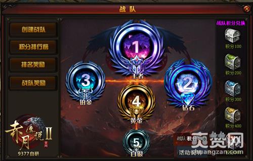 9377《赤月传说2》玩家可在战队界面内消耗1000元宝创建由自己命名的战队,并邀请两位好友加入战队。战队积分将参与全区全服积分排名,进入前八名的玩家在结算时获得战队排名称号奖励。9377《赤月传说2》战队积分达到对应级别如白银、黄金、白金、钻石和王者分段时,可领取阶段积分奖励!!