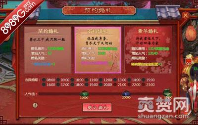 新人登记完成了之后可以根据需要的时间段预约婚礼哦!婚礼分为:简约婚礼、高档婚礼、奢华婚礼三种,可以根据需要预约哦!每场婚礼只有20分钟,各位新人需要注意时间哦!在游戏里面消耗元宝预约可以活动稀有宠物,新人们不要错过哦,还有大量的人气值。