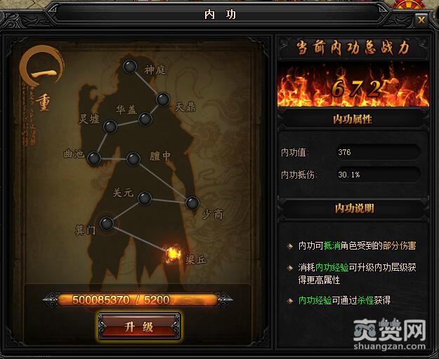 一重升级箕门所需内功经验:5200,初始内功值:376,内功抵伤:30.1%。