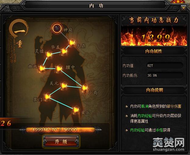 一重升级神庭所需内功经验:36000,初始内功值:827,内功抵伤:30.9%。