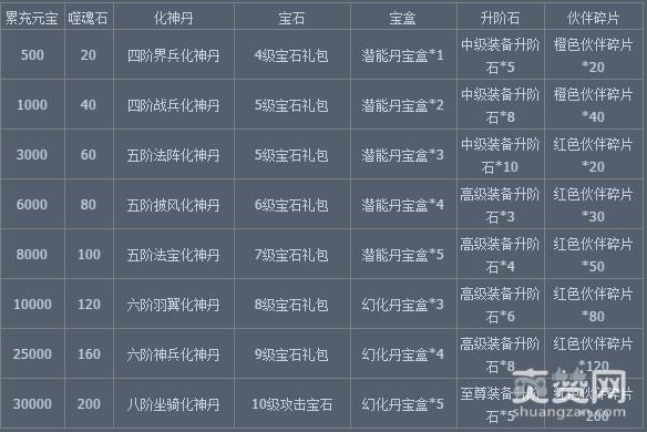 【活动描述】活动期间,累计充值元宝达到对应阶段即可获取超值豪礼。