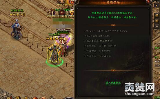 进入神魔禁地的条件相对有些苛刻,尊贵的VIP可以免费进入,非VIP玩家每次进入需要消耗300绑元。原来这里就是傲天天地诸神VIP玩家的天堂,难怪顶部会显示VIP副本;非VIP玩家也不要灰心,只要你拿到足够多的绑元,一样可以进去挂机几小时。