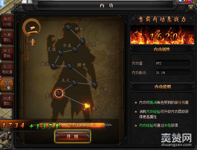 二重升级箕门所需内功经验:106400,初始内功值:972,内功抵伤:31.1%。