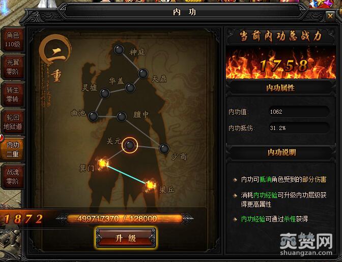 二重升级关元所需内功经验:128000,初始内功值:1062,内功抵伤:31.2%。