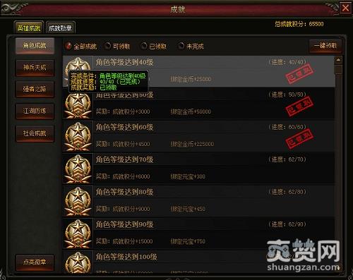 923yx《七杀》中成就积分可以通过元宝购买积分令牌获得,不过这很耗费金钱。另一种获取方式就是完成英雄成就获取。英雄成就一共有5种,分别为角色成就、神兵天成、强者之路、江湖历练、社会成就。其中角色成就和社会成就还是比较好完成的,都是一些等级、登录、战力、加好友、行会之类的。