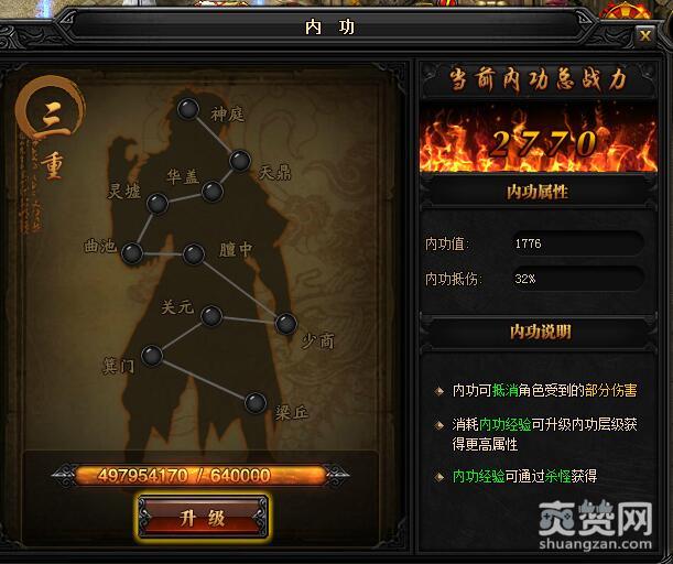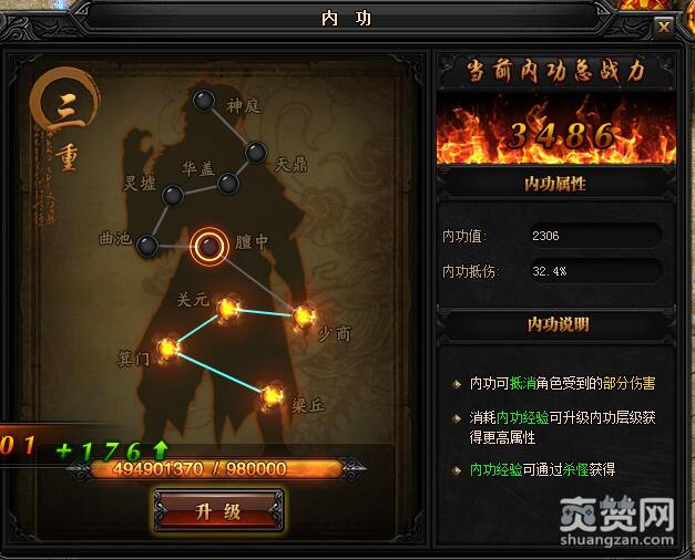 三重升级膻中所需内功经验:980000,初始内功值:2306,内功抵伤:32.4%。
