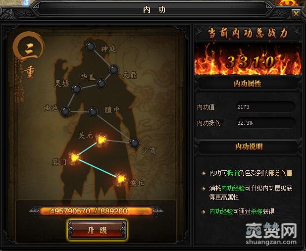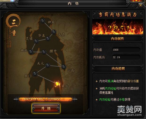 三重升级箕门所需内功经验:720800,初始内功值:1908,内功抵伤:32.1%。