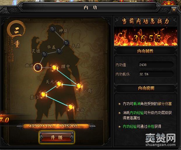 三重升级曲池所需内功经验:1075200,初始内功值:2438,内功抵伤:32.5%。