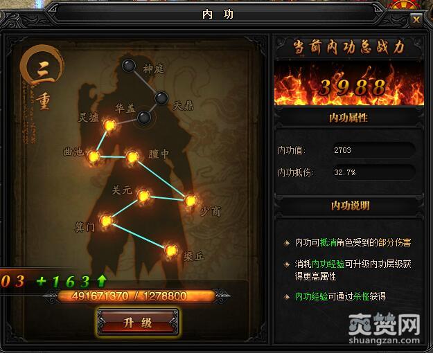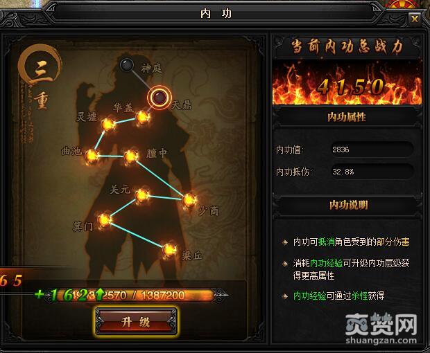 三重升级关元所需内功经验:802800,初始内功值:2041,内功抵伤:32.2%。