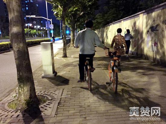 近日,有申城市民向解放日报-上观新闻反映,晚上散步时,经常看到一些人同时占着两辆共享单车。他们不仅脚下骑着一辆共享单车、一只手还推着一辆,两辆车并排,在人行道上来回转悠。散步的居民常避之不及,居民们不解,这是在干什么?
