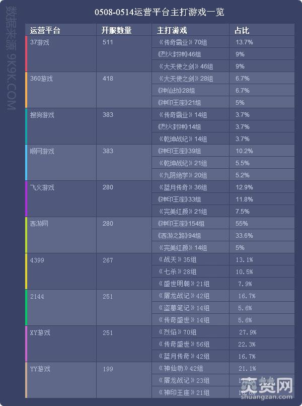 点评:本周各运营平台主打游戏开服情况较上周有所变化,37游戏将《烈火封神》推为平台主打游戏、开服频率达到了7服/天;360游戏、飞火游戏和YY游戏则同时将《神印王座》推为平台主打游戏,日开服频率皆保持在一个较高的水平;搜狗游戏则是将《烈火封神》、《乾坤战纪》推为平台主打游戏,并都保持着2服/天的开服频率。