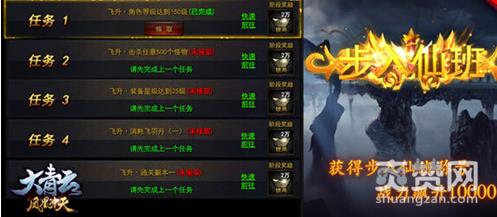 大青云为广大玩家准备了丰厚的银两,每完成1项任务即可获得2万银两。此外,完成每一阶段的飞升,还可获得仙班称号、启动炼器、获取佛珠、斩获龙脉、铸炼玄兵,总之有了飞升就是要你变得更强!
