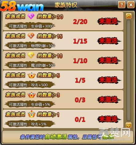 家族成员冒险特权等级V5以上的数量大于等于20,家族成员冒险特权等级V7以上的数量大于等于17,家族成员冒险特权等级V9以上的数量大于等于10,家族成员冒险特权等级V11以上的数量大于等于5,家族成员冒险特权等级V13以上的数量大于等于3,家族成员冒险特权等级V15以上的数量大于等于1,满足了这些条件中的一条或者多条,都可以自动激活属性,且属性可以叠加.