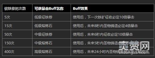 活动内容:活动期间,达到以下铁矿大征收要求,即可获赠额外铁矿奖励,并领取相应的暴击Buff!
