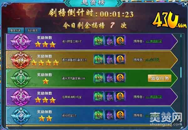 43u《修天决》悬赏榜玩法中众星云集,任何人都能在榜单中刷新自己的成就,让全服玩家看到自己的不朽伟业。悬赏榜上难度从一星到四星递增,一旦揭开榜单,玩家便要努力完成自己的职责,一星怡情,四星那就没那么容易了,若无法完成,还需花钱消榜或等待一日。