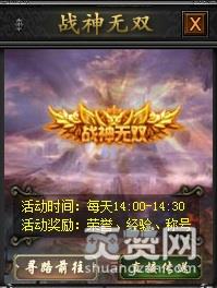 战神无双活动在每个区开区第二天开始,在每天的14:00-14:04可以在沙漠土城的“战神无双管理员”处报名参加擂台,期间禁止PK,14:05至14:30为活动时间。进入地图后,所有玩家隐藏角色名。活动开始后,模式为全体攻击,开始击杀战神阿瑞斯,争夺阿瑞斯掉落的战神之剑。