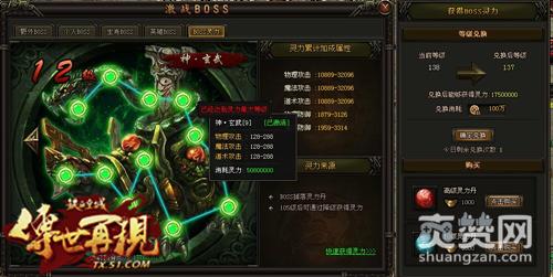 BOSS灵力有青龙、白虎、朱雀、玄武四个阶层,每个阶层12个等级。点亮魂点需要消耗灵力,并且可以激活属性,等级魂点越高,属性加成越多,当前阶层魂点全部点亮之后,才可进入下一阶层。