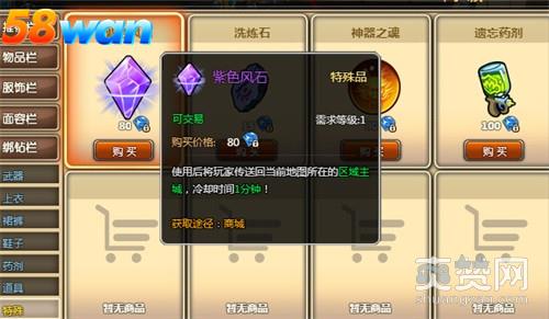 紫色风石,鸡肋一般的传送效果.相对于五彩风石的功能而言,太过鸡肋.使用紫色风石后只能将玩家传送回当前地图所在的区域主城,而且冷却时间有1分钟.玩家使用紫色风尘,只是能节省一部分时间,可以快速回到主城而言.不过紫色风石价格相较于五彩风石和橙色风石也要来得便宜.