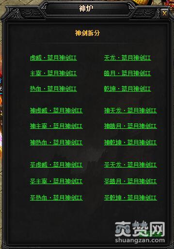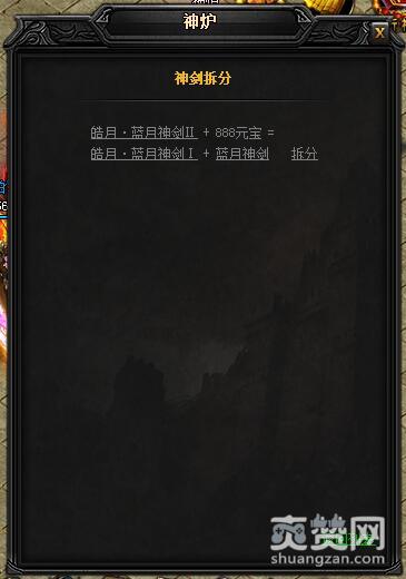 拆分的方法是到神炉处,点击蓝月神兵中的神剑神甲,然后在弹出的对话框中选择一项。这里我们选择的是蓝月神剑II