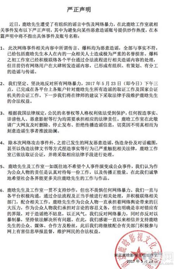 5月23日下午,鹿晗工作室就此发表严正声明,称之“均为恶意造谣”,并称已经完成对各平台的所有造谣的取证工作,将进一步维权。随后,鹿晗经纪人杨思维也微博发声,“取证过程虽然复杂,但有法可依,法盲们不要觉得匿名胡说八道就没事了。”