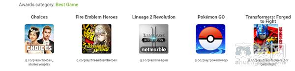 此外,被提名的游戏还有《Choices(选择)》 《Fire Emblem Heroes(火焰纹章:英雄)》《Pokémon GO(精灵宝可梦 Go)》《天堂2》。